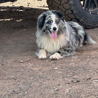 This is a picture of my husband and I with our very first Aussie on her first offgrid adventure! We fell in love with Aussies when he gave her to me after I graduated from college. We’ve always loved going on outdoor adventures; hiking, camping, rafting, pretty much anything outside. And we wanted a dog who we could take with us. That’s what turned us on to the Aussie! They had the energy we wanted, but more importantly, the intelligence and loyalty we needed to be able to take them along. That’s when we decided to take the plunge and get our first fur baby as a couple. And that was it. That’s how every other breed of dog was ruined for us! There was no going back, we will never have anything other than an Aussie from here on out! She was the best dog either of us had ever known; smart, loving, and loyal. And that’s why we decided we wanted to breed. We honestly believe that there is no better furry companion than the Australian Shepherd and it is our honor and joy to be able to raise the puppies that become those perfect companions!